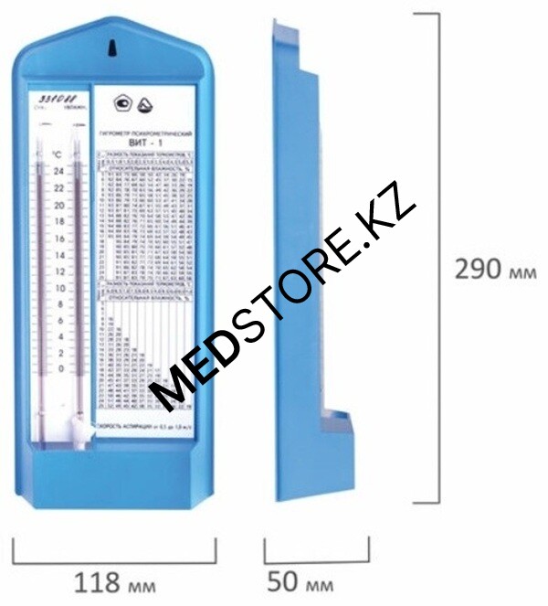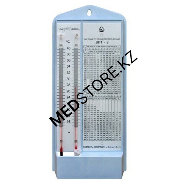 Гигрометры психрометрические ВИТ - предназначены для измерений в помещениях относительной влажности от 20 до 90% и температуры окружающего воздуха от 0 до 40 градуса Цельсия. Гигрометр представляет собой прибор, состоящий из двух одинаковых термометров, «сухого» и «влажного», смонтированных на металлических шкальных пластинах. Принцип действия гигрометра основан на измерении температуры воздуха между двумя термометрами, резервуар одного из которых увлажняется с помощью фитиля, смачиваемого дистиллированной водой. Установившееся показание «влажного» термометра определяется динамическим равновесием между влагой на фитиле и влагой окружающего воздуха. Шкальные пластины вмонтированы в пластмассовый корпус, между шкальными пластинами расположен стеклянный резервуар, который предназначен для питания фитиля «влажного» термометра. В корпус гигрометра вмонтирована психрометрическая таблица, рассчитанная для скорости воздушных потоков от 0,5 до 1 м/с.